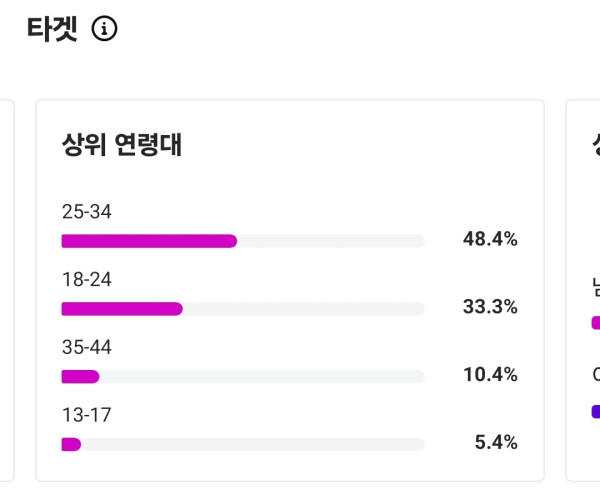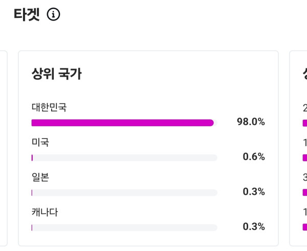 상위 국가 - 대한민국 98%, 상위 연령대 - 25~34, 성별 - 남성 70.8%, 여성 29.2% 입니다.