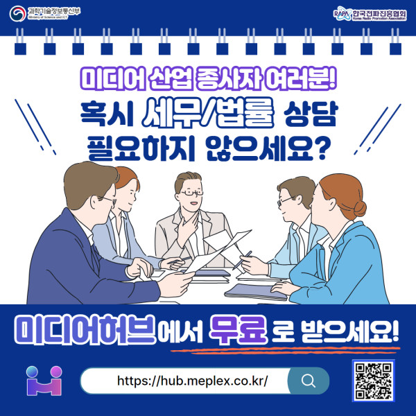 [한국전파진흥협회] 세무/법률 관련 고민에서 벗어나는 가장 쉬운 방법! ‘미디어허브‘에서 무료 상담 받으세요!