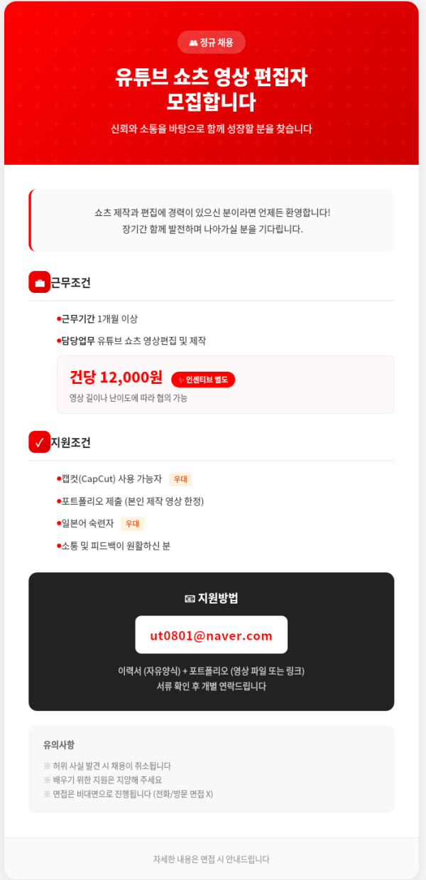 - 유튜브 쇼츠편집자 구인!!!