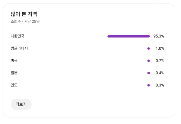한달간 운영하며 한국 98프로 비율로 알고리즘이 적용되었고, 계속 운영하면 확실한 수익원이 될 거 같은데 본업이 너무 바빠져서 유튜브를 할 시간이 없어 판매하게 되었습니다.