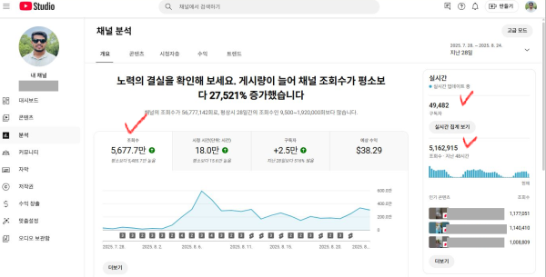 운영기간 동안 205개의 영상을 업로드했으며, 총 조회수는 5,677만, 구독자 4만 9천명을 달성했습니다. 48시간 조회수도 역대급으로 활성화돼있습니다.