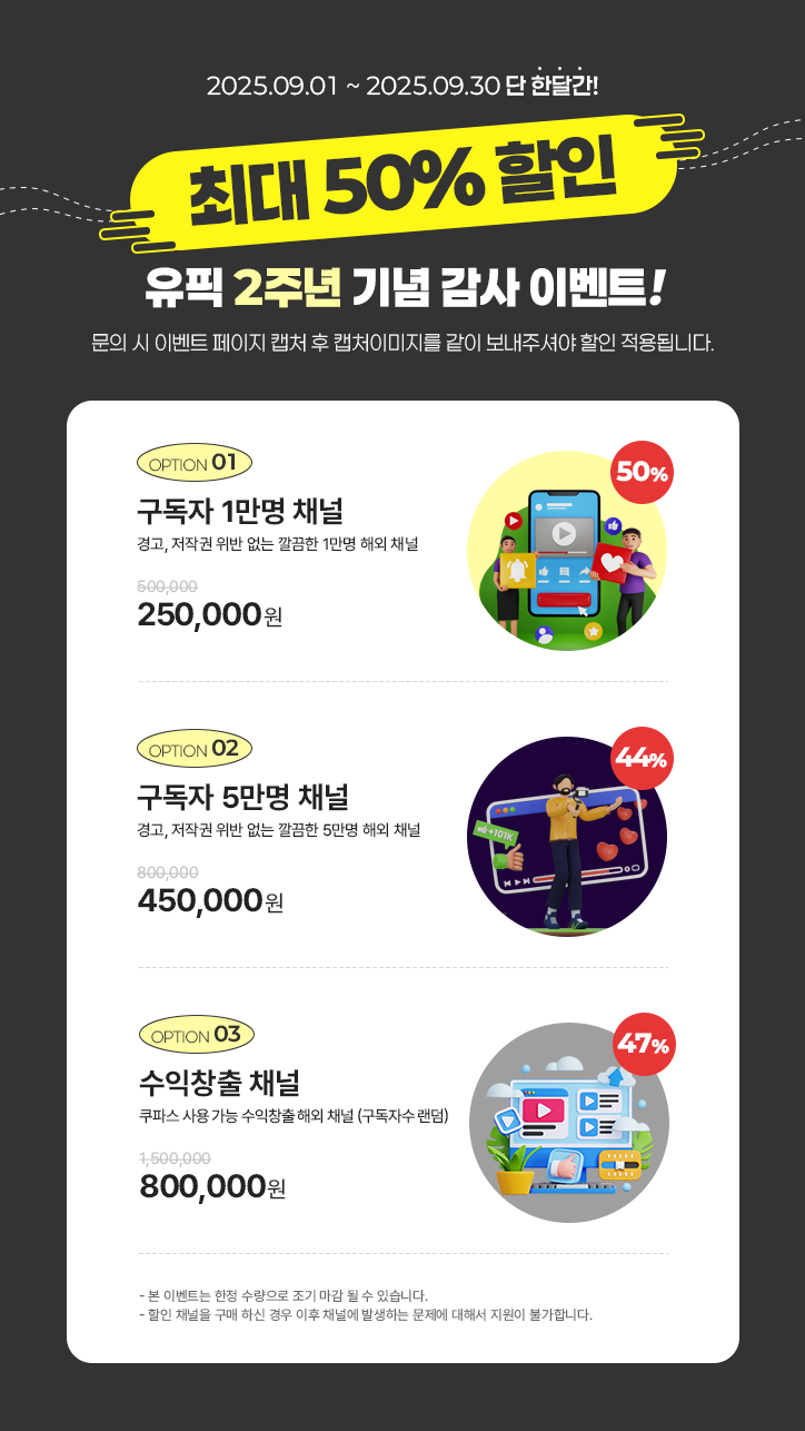 저희 유픽이 2주년을 맞아 다양한 채널을 최대 50% 할인 진행 중입니다.