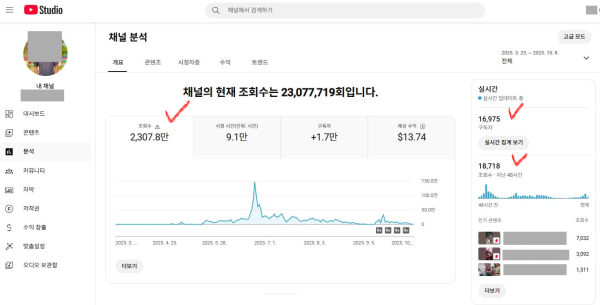 운영기간 동안 866개의 영상을 업로드했으며, 총 조회수는 2300만, 구독자 1만 6천명을 달성했습니다. 48시간 조회수도 활성화돼있습니다.