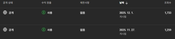 최근 영상 12월1일 업로드 조회수 발생됩니다