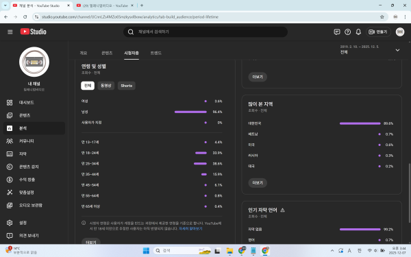 - 다음글순수 국내 채널 수익창출O,쿠파스O 구독자212.000명 롱폼 채널 판매 합니다. 누적수익 404.600.000원2025.12.14